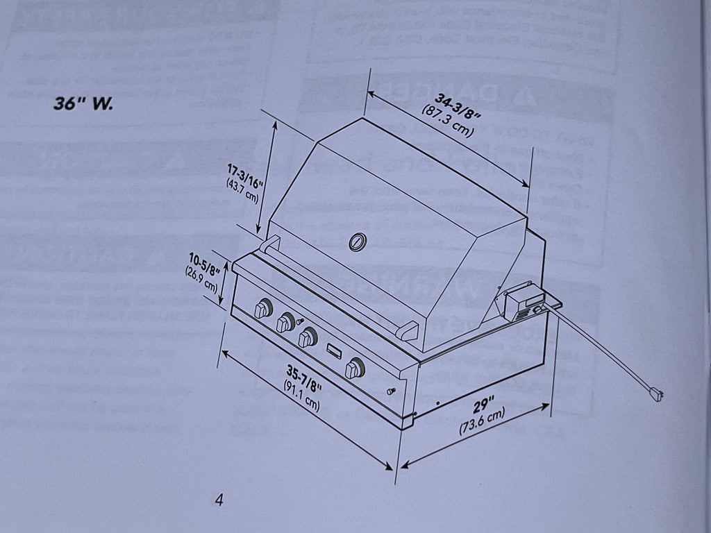 • 36" W x 29" D x 28" H (grill); 36" W x 38" H x 24" D (cart).