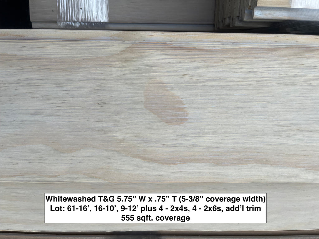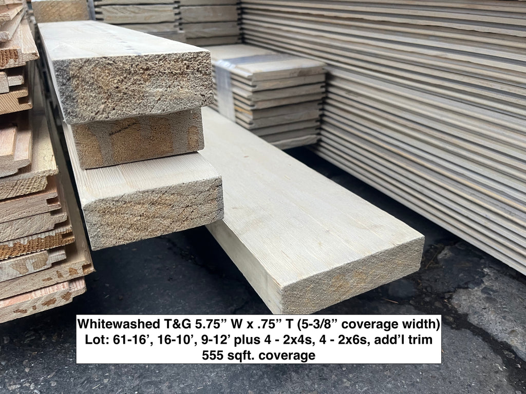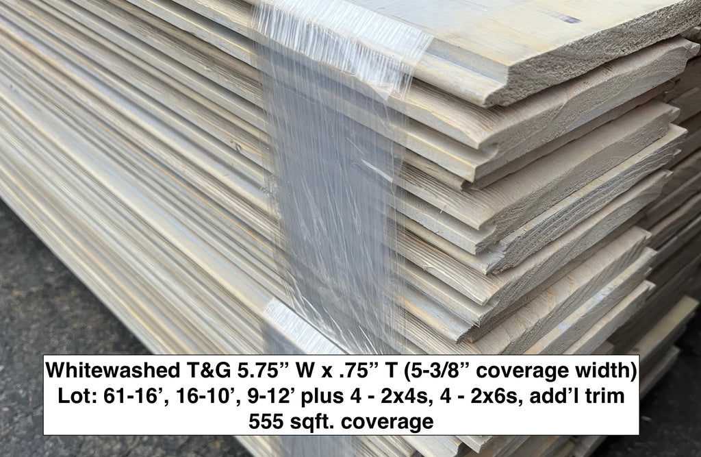 • Whitewashed T&G 5.75” W x .75” T (5-3/8” face width): 61 - 16’, 16 - 10’, 9 - 12’ = 555 sq.ft. total (also 4 - 2x4s, 4 - 2x6s, & add'l trim pieces).
