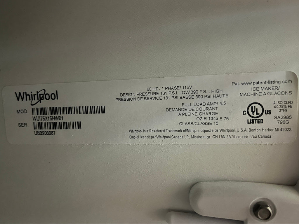 Get your hands on this 15", built-in, under-counter Whirlpool ice maker! This handsome and helpful unit was previously installed, carefully removed, and is in excellent fully functional condition. Save hundreds over new!